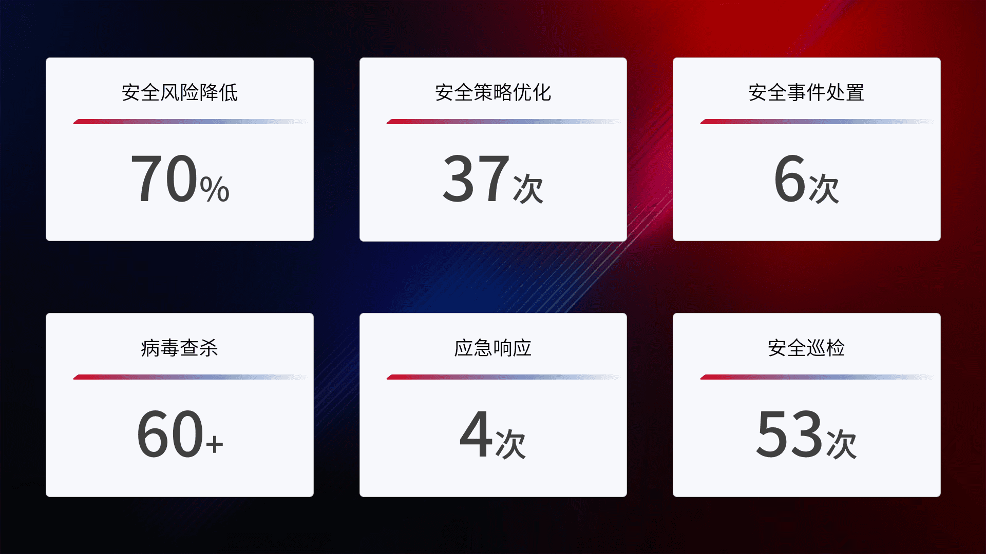 提供全面的安全事件报告体系,,,,包括处置报告、、周报、、、、季度和年度总结,,,结合持续监控,,,帮助客户深入了解网络安全状况。。。